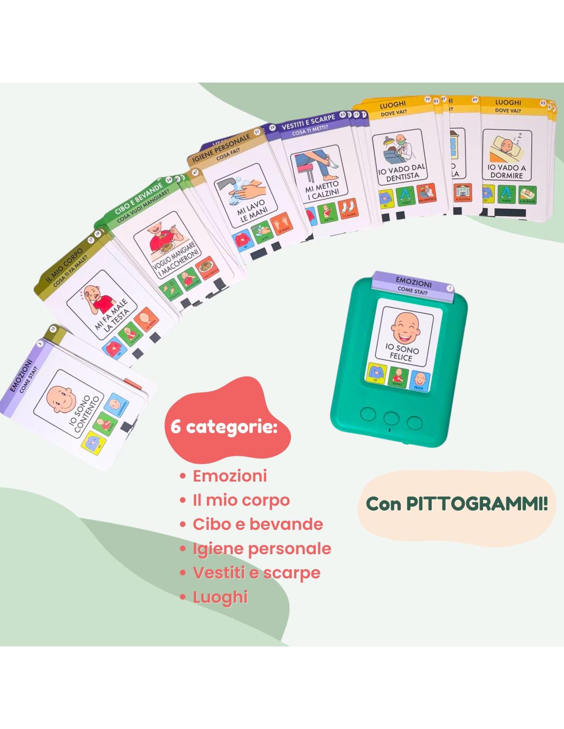 Include 50 flash card Montessori fronte-retro: 100 frasi semplici e quotidiane, ciascuna accompagnata da pittogrammi chiari che facilitano l’associazione visiva e uditiva. Perfette per stimolare la comprensione e la produzione del linguaggio.